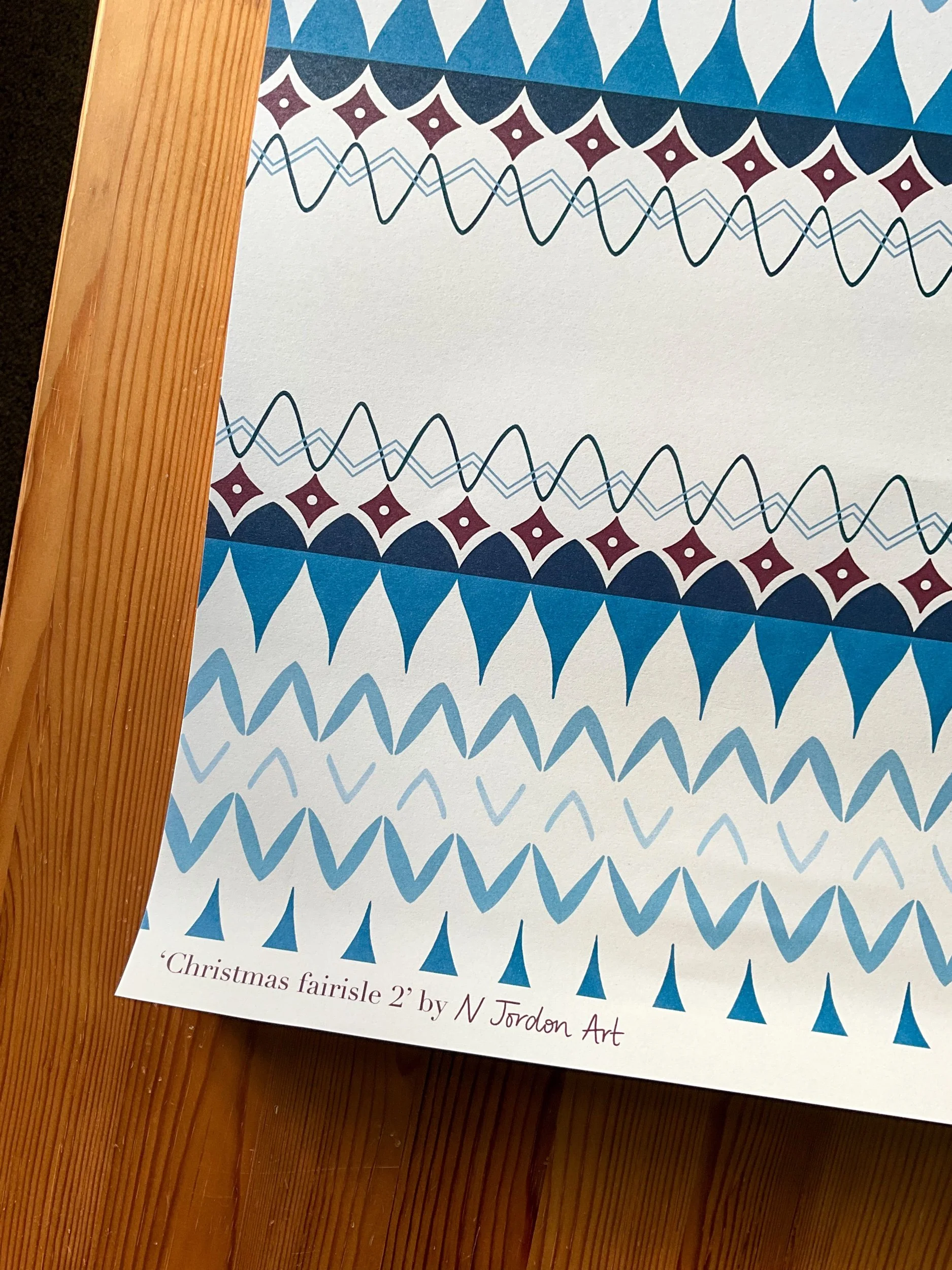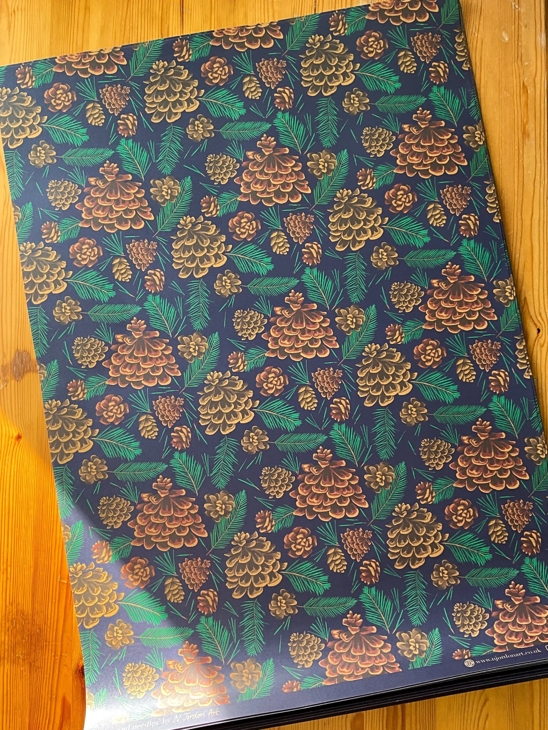 Set against a warm maroon background, this hand-drawn digital design was inspired by cozy winter knits and Fairisle-esque patterns. Printed on recycled and uncoated 120gsm paper, it aligns with N Jordon Art’s eco-conscious values, allowing you to wrap your gifts both beautifully and sustainably.