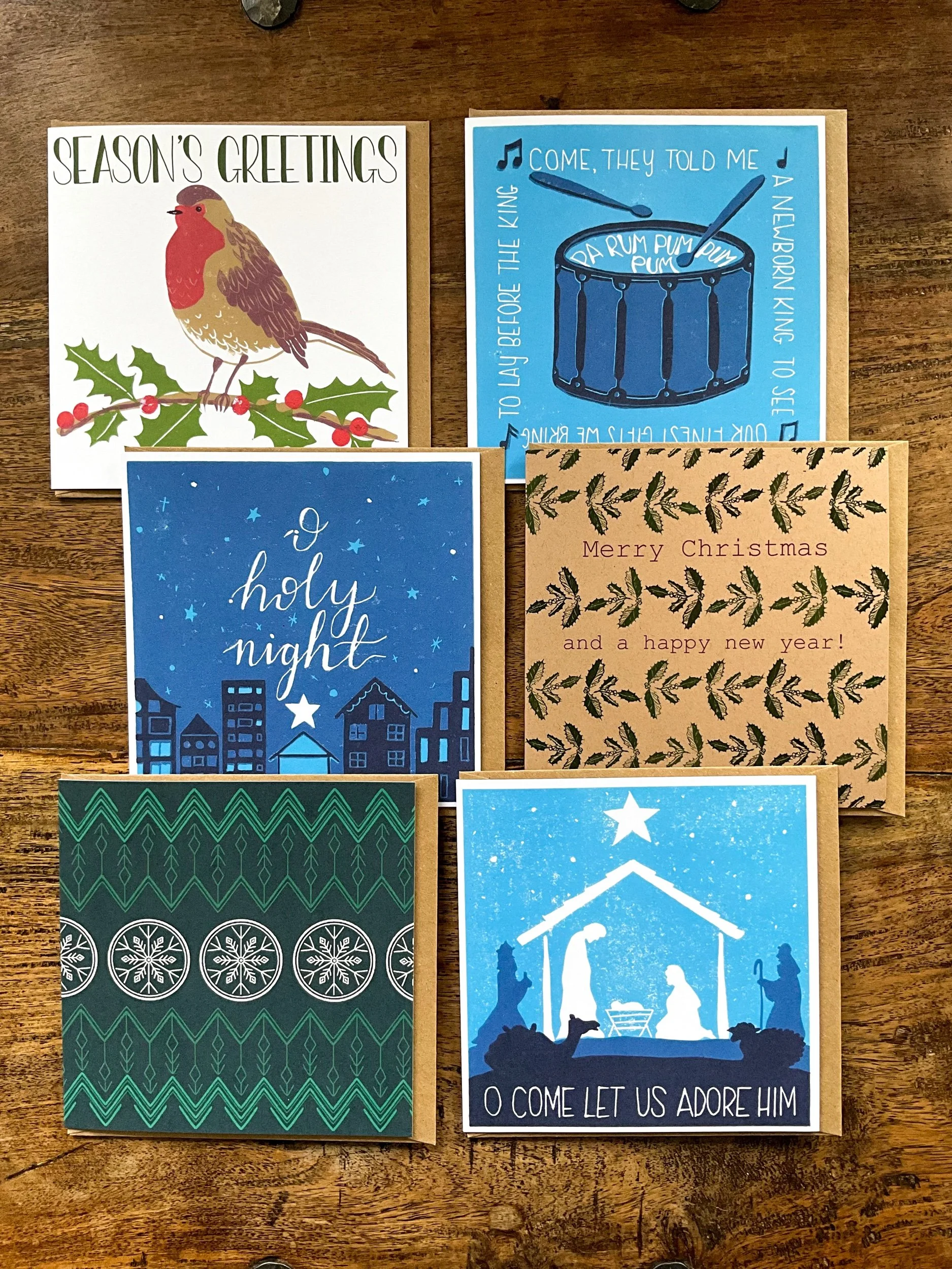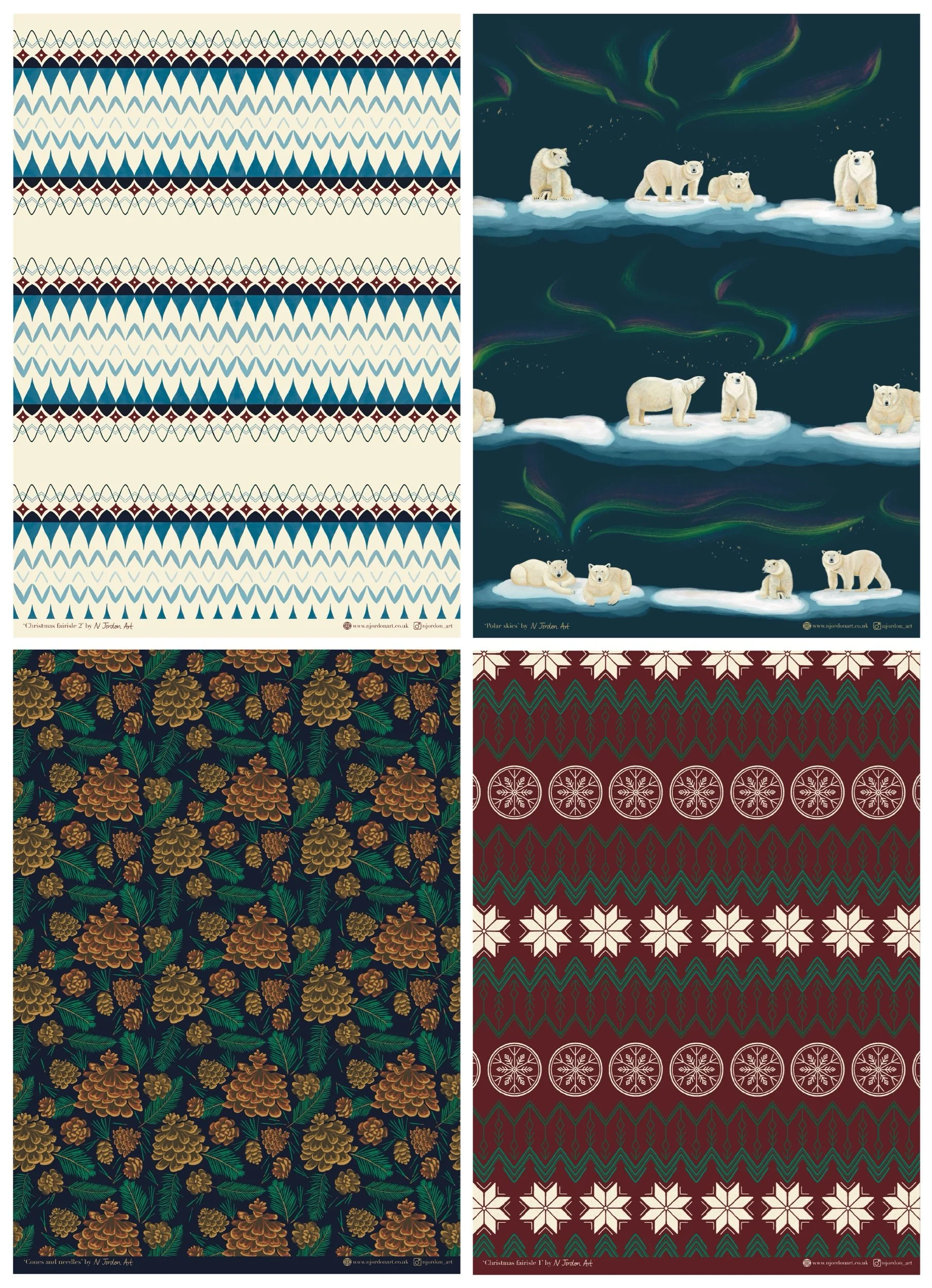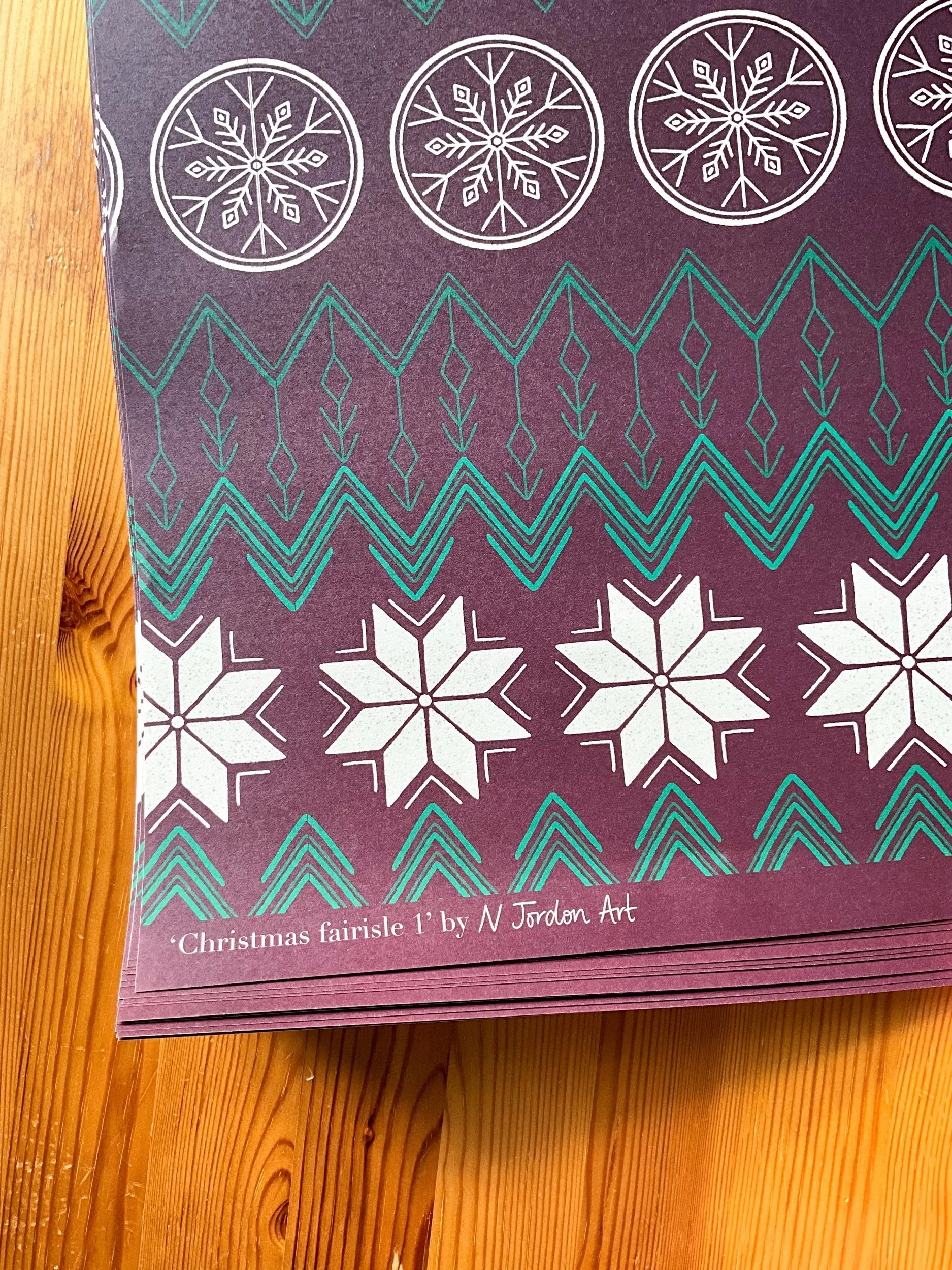 Designs included: one each of ‘O Come’, ‘Little Drummer’, ‘O Holy Night’, ‘Strings of holly, ‘Robin red breast’, and ‘Festive Fairisle’ (6 cards in total). These are all original N Jordon Art designs.