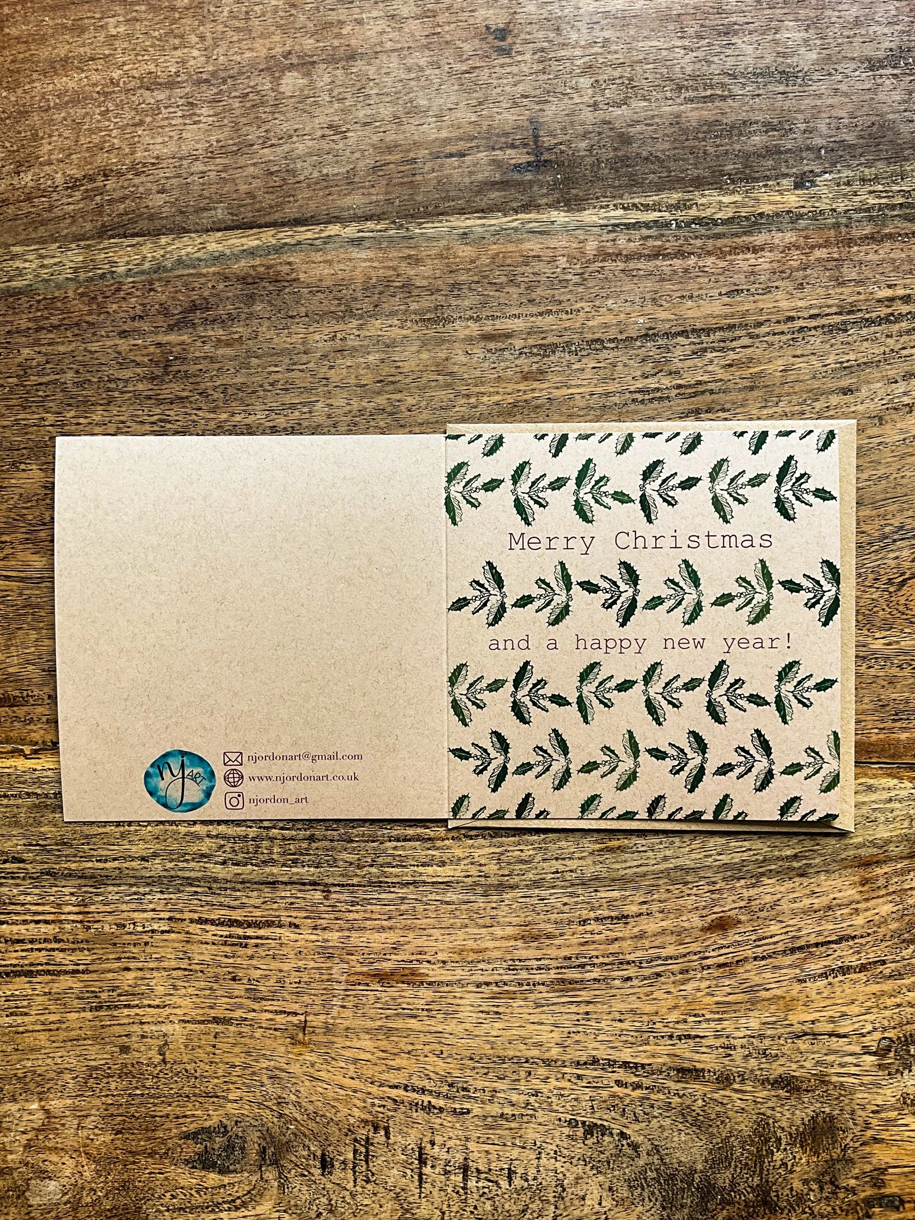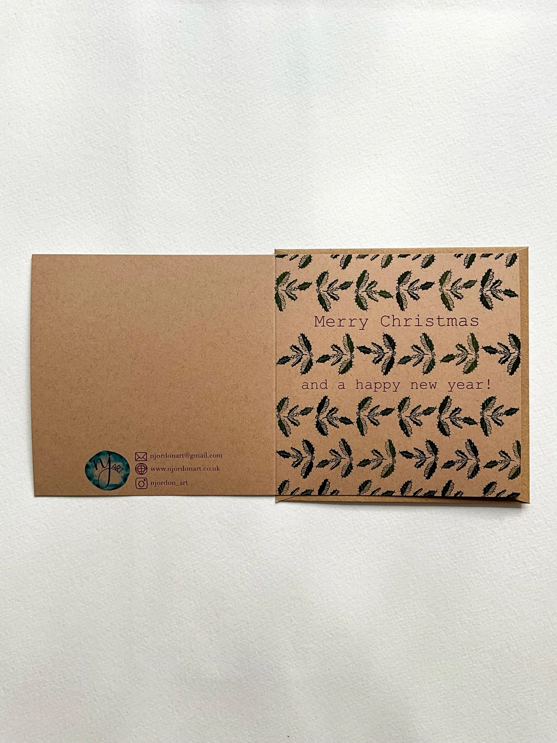 These Christmas cards are high-quality digital prints built up from my original linocut artwork, printed onto Kraft brown 350gsm card.